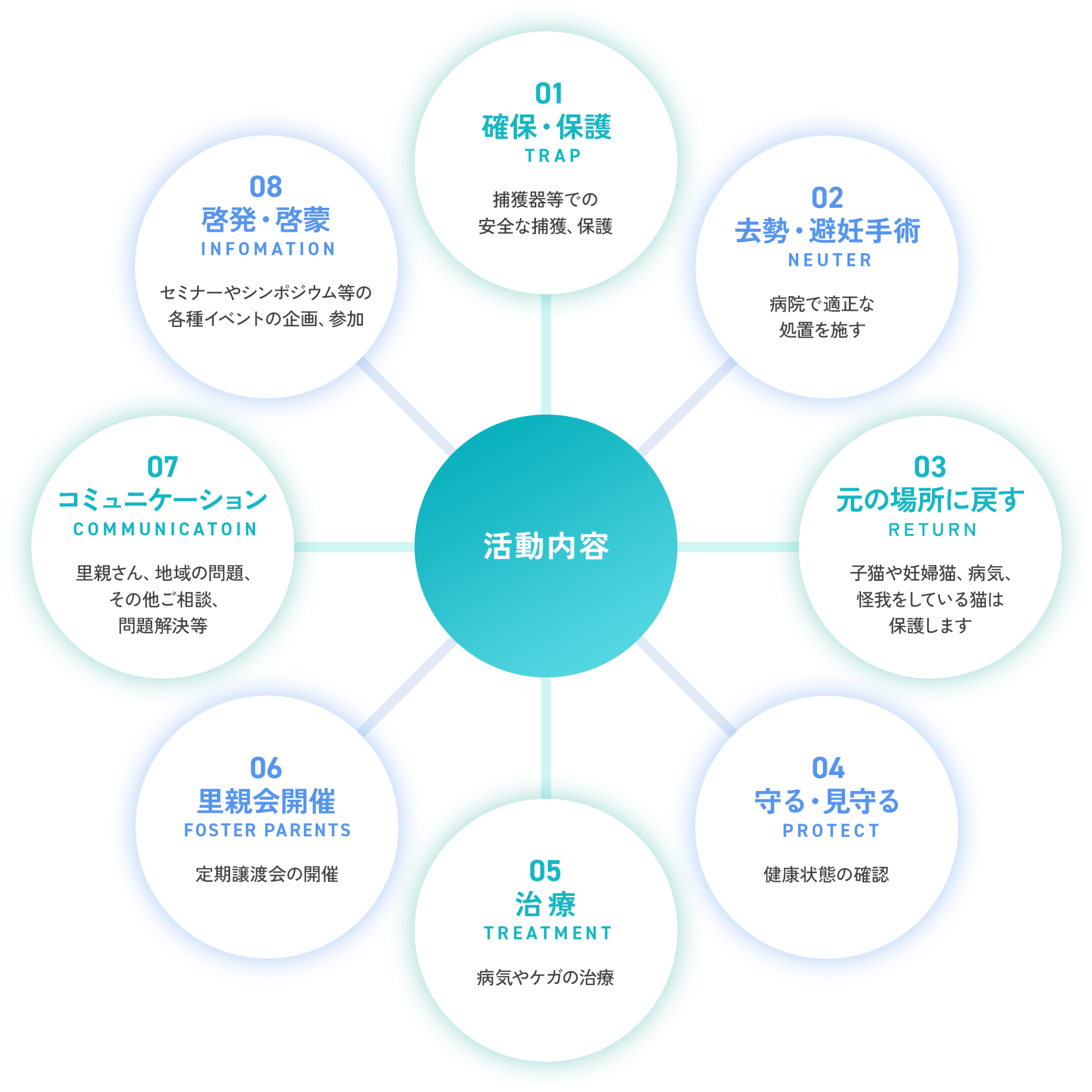 すでに妊娠している猫はそのまま保護し、ハウスで出産させます。 産まれた子猫や人と仲良くしてくれる猫など、一部の猫は、保護後血液検査を行い、 新しい家族として迎え入れてくれるご家庭を募集します。